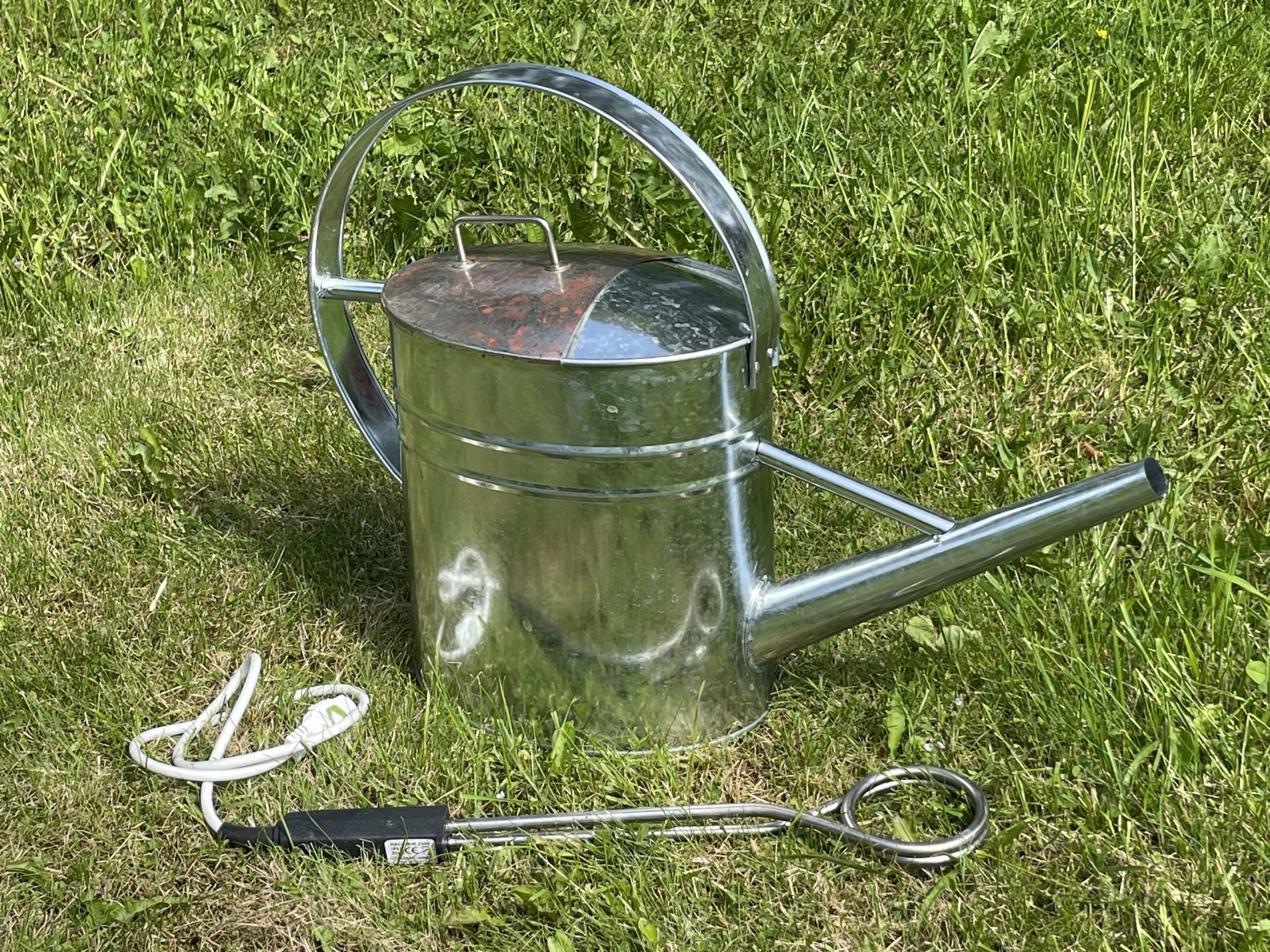 Kehittelin kuumalla vedellä kastelua varten yhdistelmän, jossa kastelukannuun kaadettu vesi kiehautetaan uppokuumentimella. Lämpövastuksen teholla 2000 W lämmittää noin 20 minuutissa kiehuvaksi kannullisen ulkolämmintä vettä.